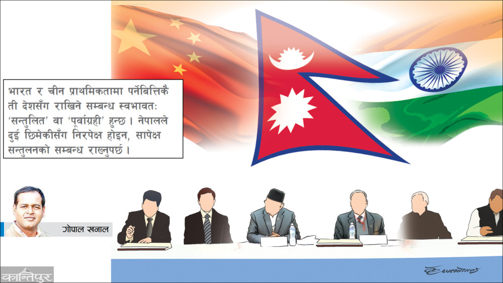भारत र चीन प्राथमिकतामा पर्नेबित्तिकै ती देशसँग राखिने सम्बन्ध स्वभावतः ‘सन्तुलित’ वा ‘पूर्वाग्रही’ हुन्छ । नेपालले दुई छिमेकीसँग निरपेक्ष होइन, सापेक्ष सन्तुलनको सम्बन्ध राख्नुपर्छ ।