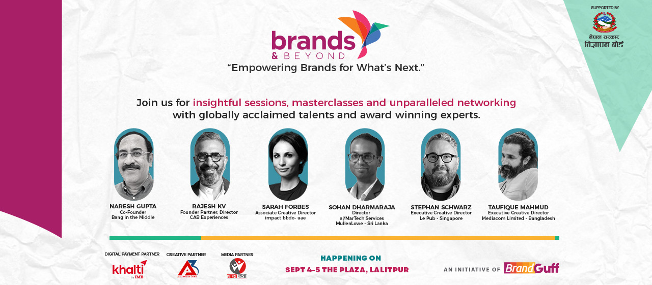 ब्राण्ड बिल्डिङ्ग, ब्राण्ड पोजिसनिङ्ग, मार्केटिङ्ग, स्टोरीटेलिङ्ग सँगै क्रियटिभ दुनियाका व्यवसायिक व्यक्ति तथा जिज्ञासुहरु सहभागी हुने ब्राण्ड्स एण्ड वियोण्ड–२०२५ यही सेप्टेम्बर ४-५ अर्थात भाद्र १९ र २० गते ललितपुरको द प्लाजामा हुने भएको छ ।